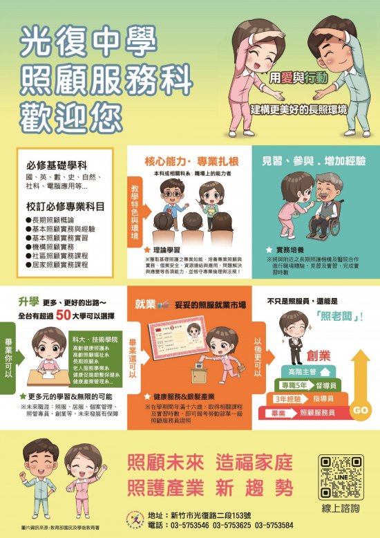 二、 該校新設立照顧服務科,針對花蓮縣及臺東縣國中畢業生進行視訊宣導。