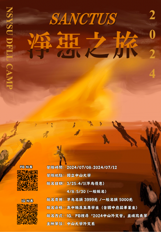 (六) | FB 粉絲專頁(2024 中山外文營): https://www.facebook.com/profile.php?id=61556837051726 ; IG 專頁(Sanctus.2024): https://www.instagram.com/sanctus.2024?igsh=dGdlenRmcnM5OXZ2 |