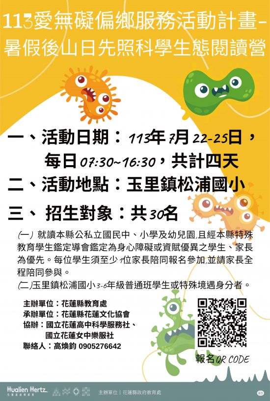 二、 | 旨揭活動訂於 113 年 7 月 22 日(一)至 7 月 25 日(四)於玉里鎮松浦國小辦理,詳情請參閱活動計畫書及報名文宣,如有疑義,請逕洽委辦單位:花蓮縣花蓮文化協會,連絡電話: 0905-276642 。 |