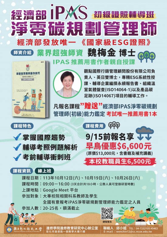 檢送本校進修學院推廣教育「113 年 iPAS 淨零碳規劃管理 師(初級)能力鑑定輔導班 (線上班) 」招生簡章,敬請惠 予公告,並鼓勵相關人員報名參加,請查照。
