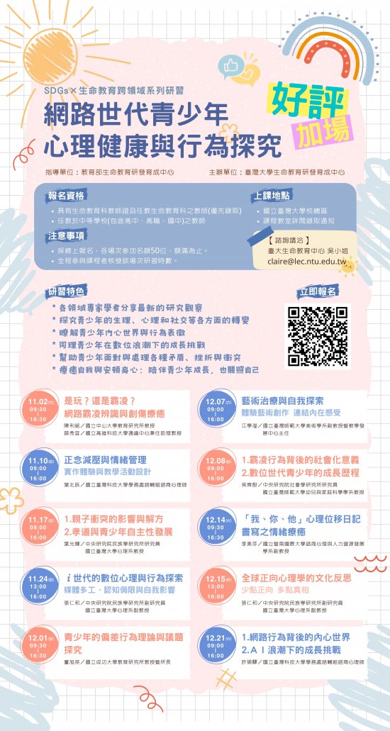 10、 | 12 月 21 日(星期六):網路行為背後的內心世界、 AI 浪潮下的成長挑戰。 |