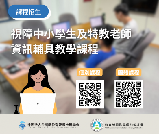 二、 為能協助視障學子克服障礙,未來於就學、就業等層面獲得更公平之機會,上開學會於 114 年獲國教署補助辦理「向下紮根、向上提升─視障學生數位資訊賦能計畫」,針對全國就讀於 1~12 年級領有身心障礙手冊之視覺障礙學生、其家長及特教或巡輔老師,提供一對一實體或遠距電腦教學及團體課程辦理。