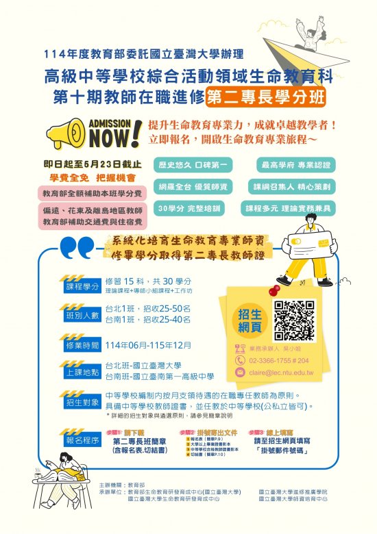 二、 為落實十二年國民基本教育課綱精神,培育高級中等學校生命教育科專業師資,教育部特委託本校生命教育研發育成中心辦理旨揭學分班。