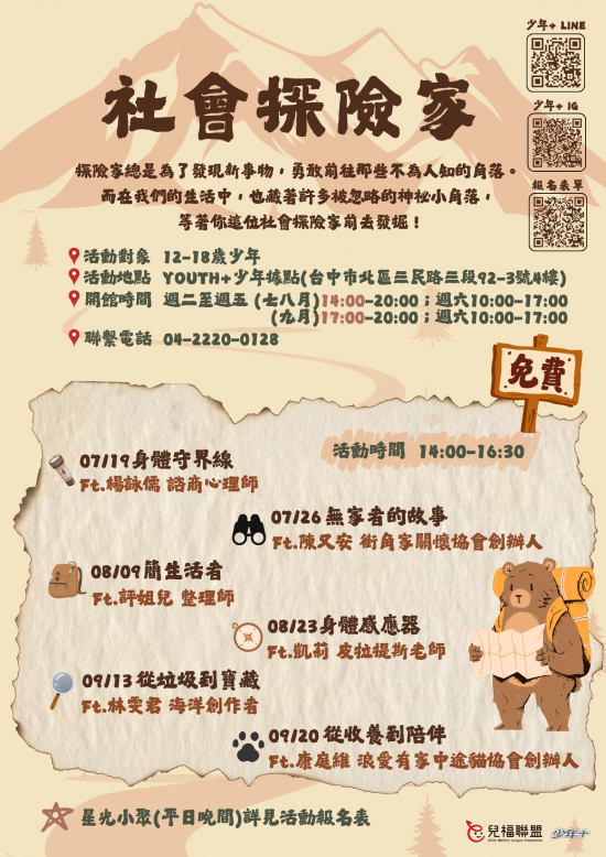 二、 | 本季規劃「社會探險家」社會共好主題活動,期待透相關課程讓孩子有機會認識與看見社會其他面貌,從中了解更多社會組織與公益團體,並落實在日常生活中。課程及報名資訊詳見活動 DM 。 |