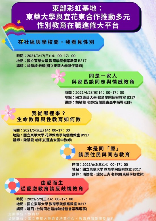 主旨: | 本校教育與潛能開發學系張德勝教授辦理東部彩虹基地:東華大學與宜花東合作推動多元性別教育在職進修大平台計畫之活動,敬邀貴校師長踴躍參與,惠請服務學校核與出席人員公假登記,請查照。 |