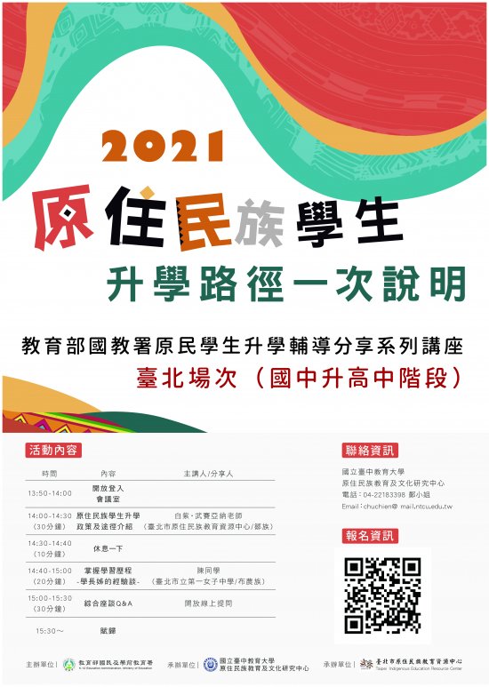 主旨: | 轉知國立臺中教育大學辦理線上「原住民族學生升學輔導講座-臺北場次」資訊,請協助公告周知,並鼓勵學生踴躍報名,請查照。 |