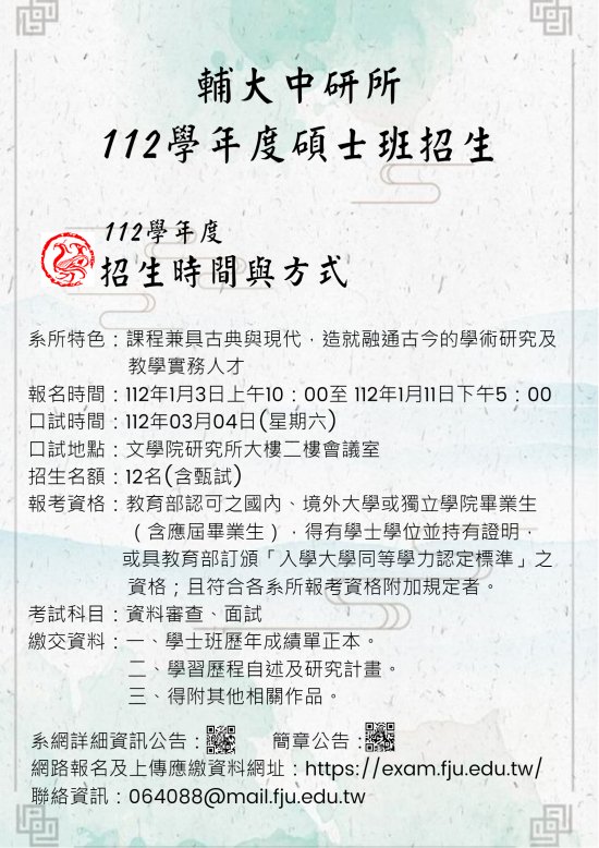 輔仁大學中國文學系研究所碩士班 112 學年度招生簡章
