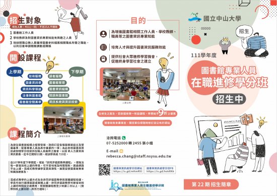 函轉國立中山大學圖書與資訊處辦理「第 22 期圖書館專業 人員在職進修學分班」下學期招生簡章,請貴校鼓勵在職 人員參加並核予公差假,請查照。
